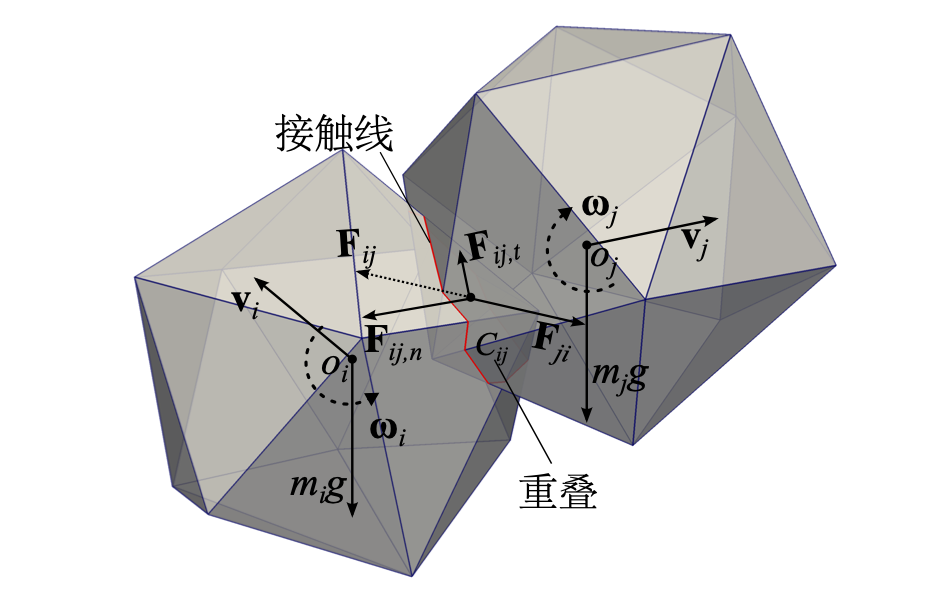 相比之下,对于多面体颗粒,颗粒间的重叠区域往往是不规则多面体,并没有明确的统一理论表达式来计算相应的几何参量。学者相继提出和发展了多种针对多面体颗粒的精确接触检测的算法,比如,公共平面(CP)算法 [2] 、快速公共平面(FCP)算法 [10] 以及内部潜在颗粒法 [1] 。这些方法能够计算多面体接触的嵌入深度,但具体算法的实现比较繁琐。因此,我们利用一种基于所谓的对偶理论 [4, 7] 的方法来求解重叠多面体。感兴趣的读者可在文献 [3, 4, 7] 中找到关于这种方法的更多细节,在此只给出主要的操作步骤,如下: