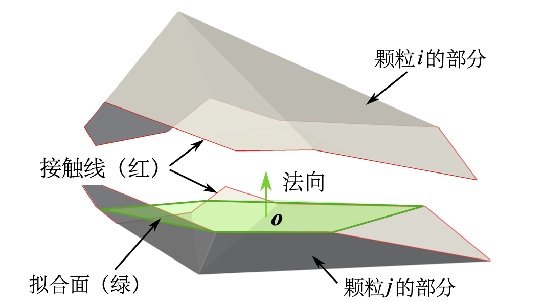 图 3.5 多面体颗粒间的接触(为便于可视化,相交多面体由接触线剖分为两部分)¶