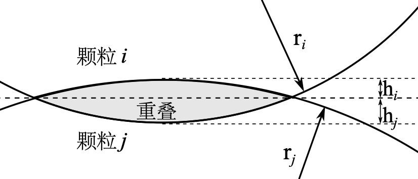 式中, \(r_i\) (或 \(r_j\) )和 \(h_i\) (或 \(h_j\) )分别是第 \(i\) (或 \(j\) )个颗粒的半径和球冠高度。其他几何参数也可以通过显式表达式给出,此处从略。