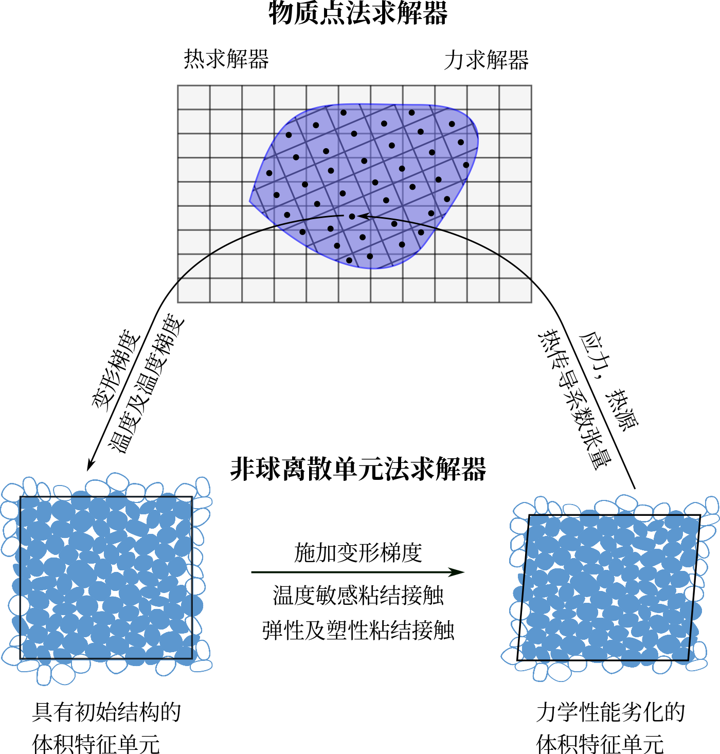 SudoSim-DEMPM 为 SudoSim 系列的多尺度模块,该模块基于 MPM2D 和 GODEM,旨在利用DEM RVE替代唯象的应力-应变本构,实现颗粒材料的跨尺度求解。SudoSim-DEMPM 继承了 MPM2D 力学、热学、多尺度及相变求解框架,同时继承了 GODEM 的球形及非球颗粒模拟架构,实现了更为丰富的颗粒材料各向异性、非共轴性以及多物理场跨尺度的模拟。