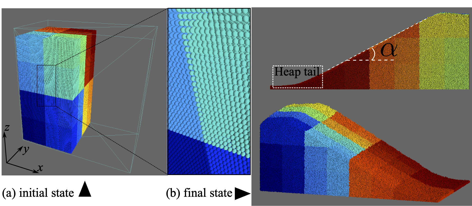本算例展示如何使用CuDEM模拟颗粒柱在重力作用下的塌落。如 图 6.2 所示,参照上一个例子 颗粒堆积 ,首先生成颗粒柱,把容器扩大,随后颗粒柱在重力作用下塌落。需要指出的是,本算例将生成的颗粒柱并未在重力作用下先平衡(即上一例子的最终堆积状态)。如你感兴趣,可以采用堆积后的颗粒柱进行塌落模拟。