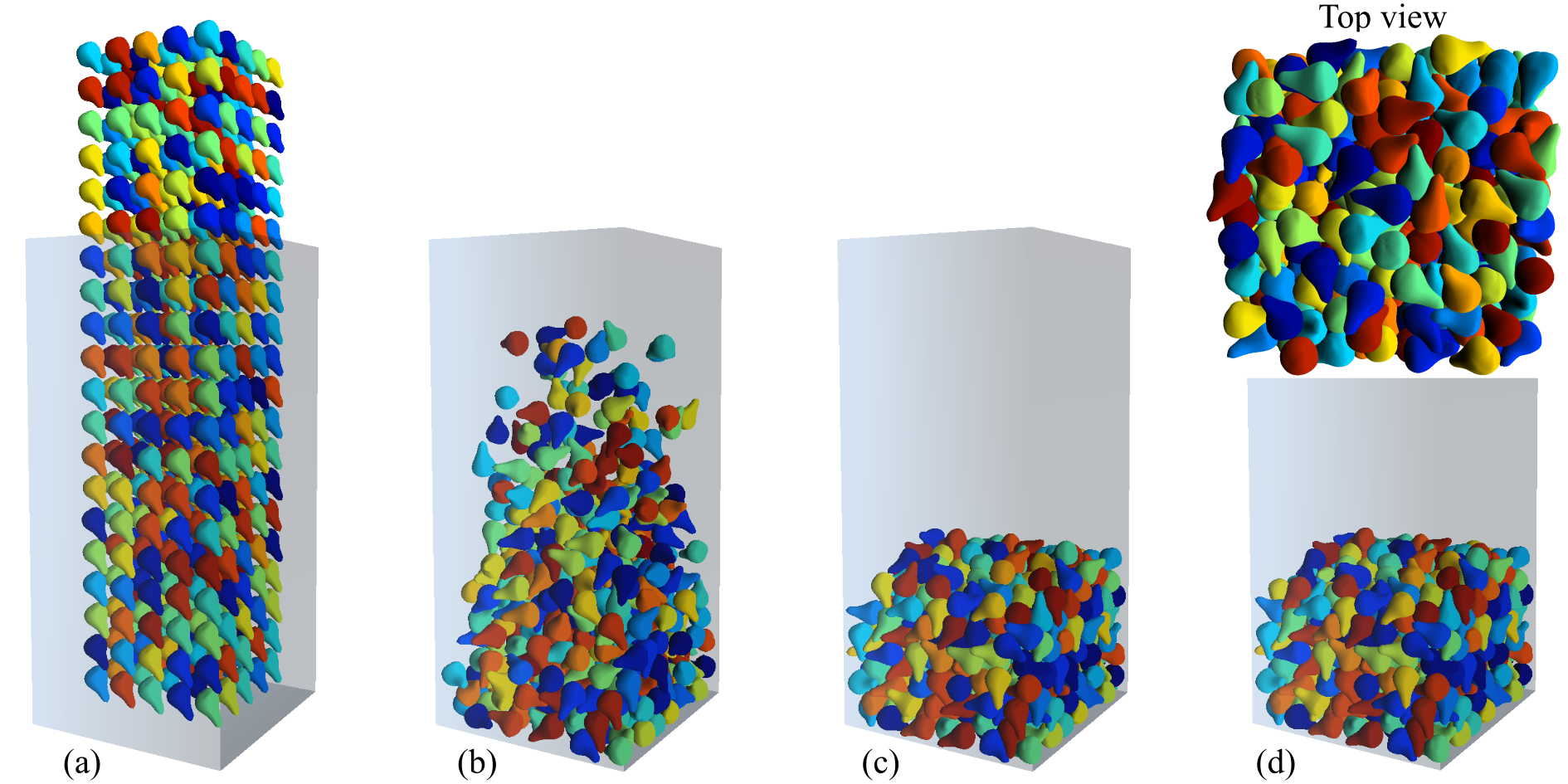 本算例将介绍如何使用RTDEM进行任意形状颗粒的堆积模拟,并以单一粒径香蕉颗粒堆积为例,如 图 7.3 所示。