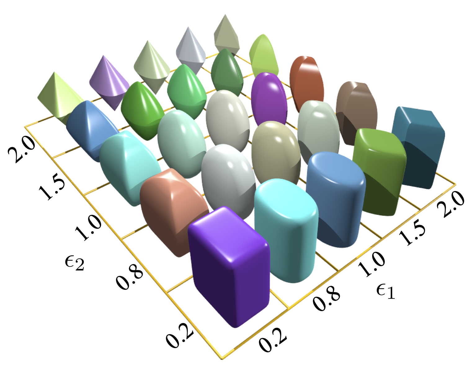 其中 \(r_x, r_y\) 和 \(r_z\) 是超椭球在x, y, z轴的半长主轴; \(\epsilon_i (i=1,2)\) 是刻画颗粒棱角度的形状参数. \(\epsilon_i\) 在 0 到 2 的变化可勾勒出非常丰富的凸超椭球形状。SudoDEM 生成超椭球的两个函数可参见如下: