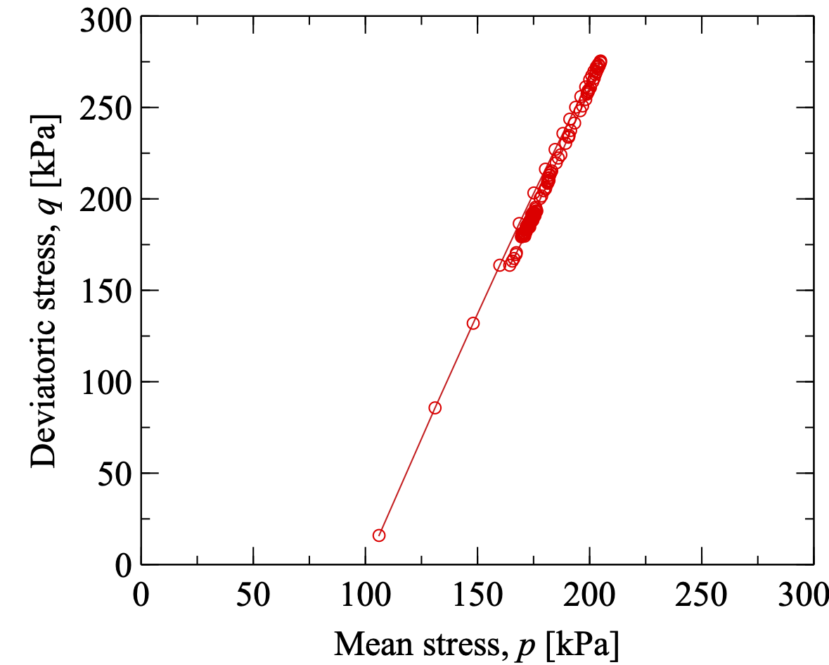 进而我们可以绘制出三轴剪切过程的应力-应变曲线以及应力路径曲线,如 图 8.9 和 图 8.10 。