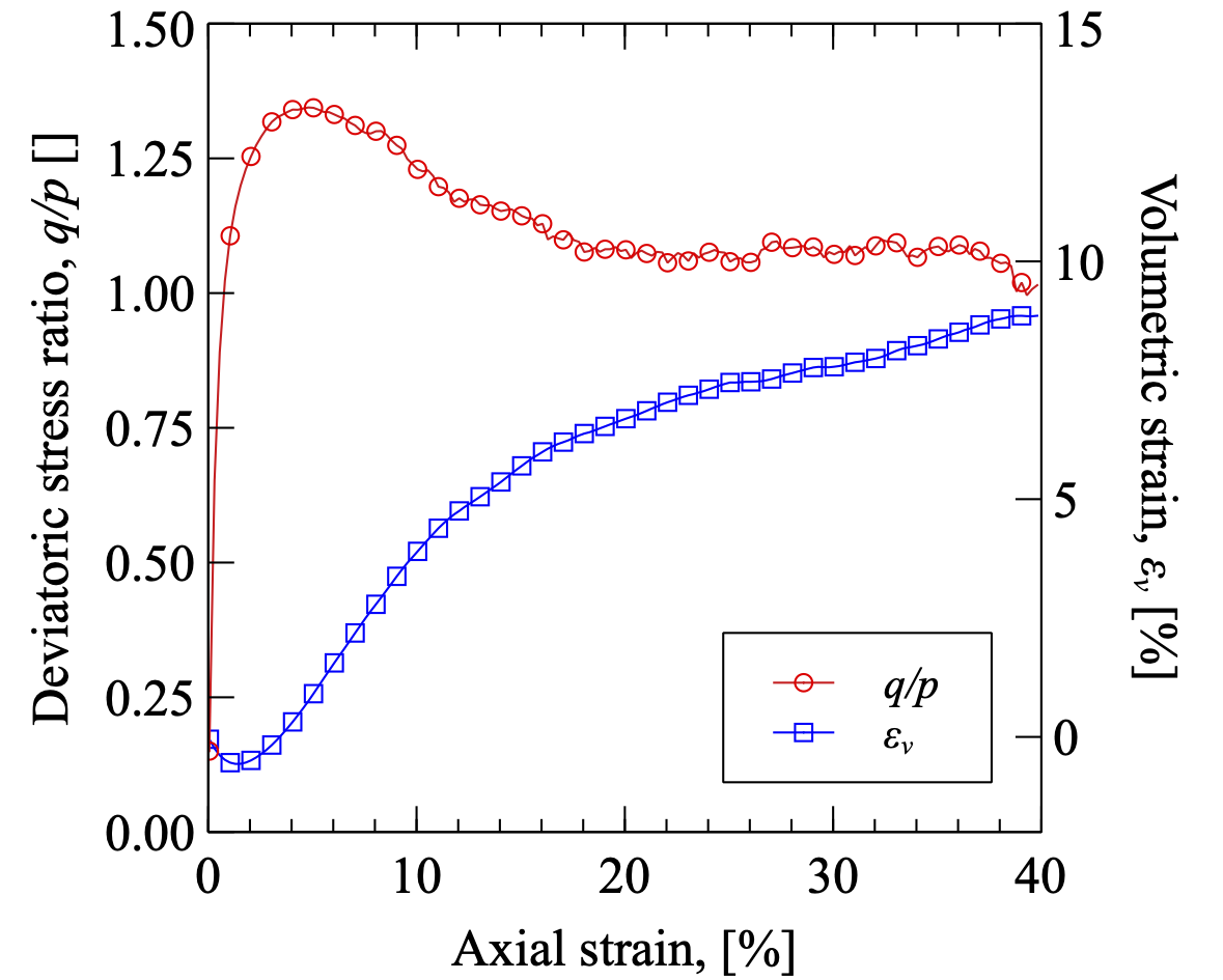 图 8.9 剪切过程中的应力应变曲线以及体应变曲线¶